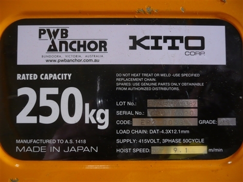 Kito ER2 Series Electric Chain Hoist, 3 Phase, 250kg S.W.L. in new condition with operation manual. Made in Japan.