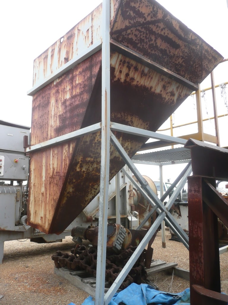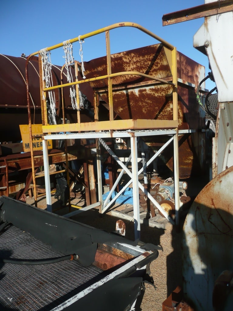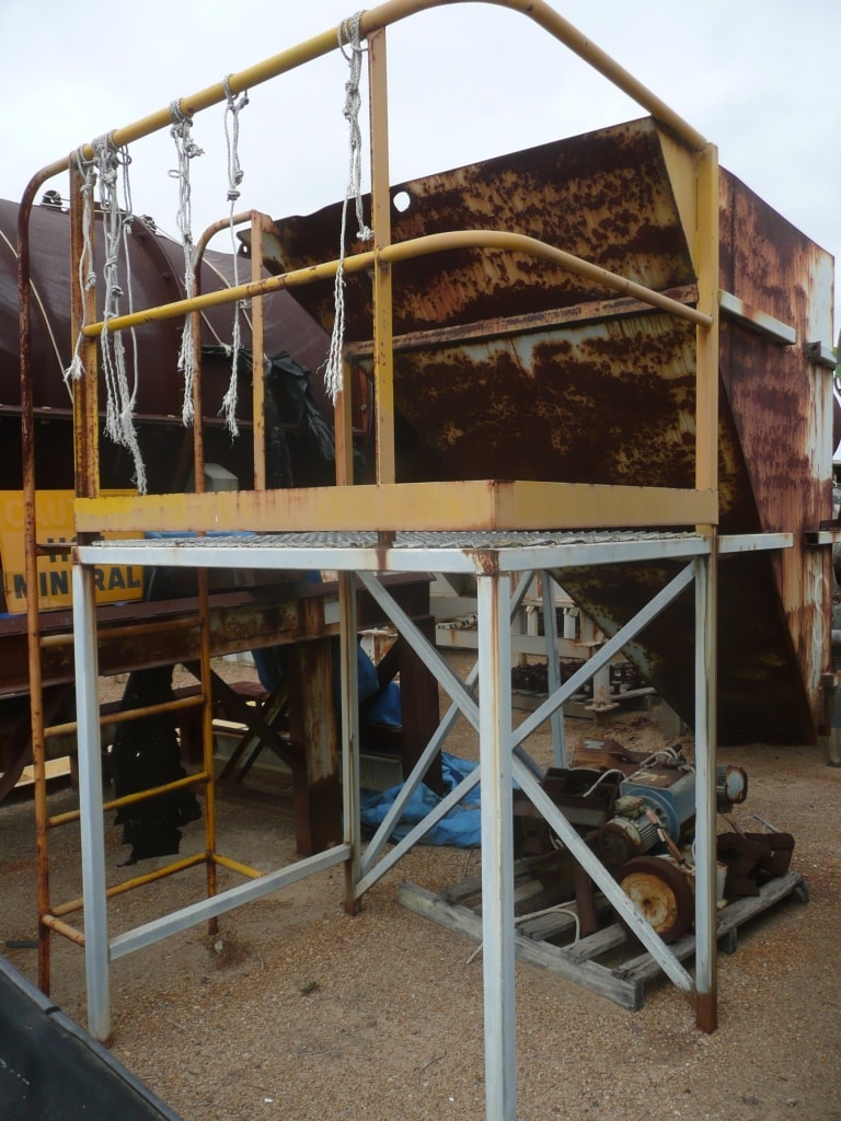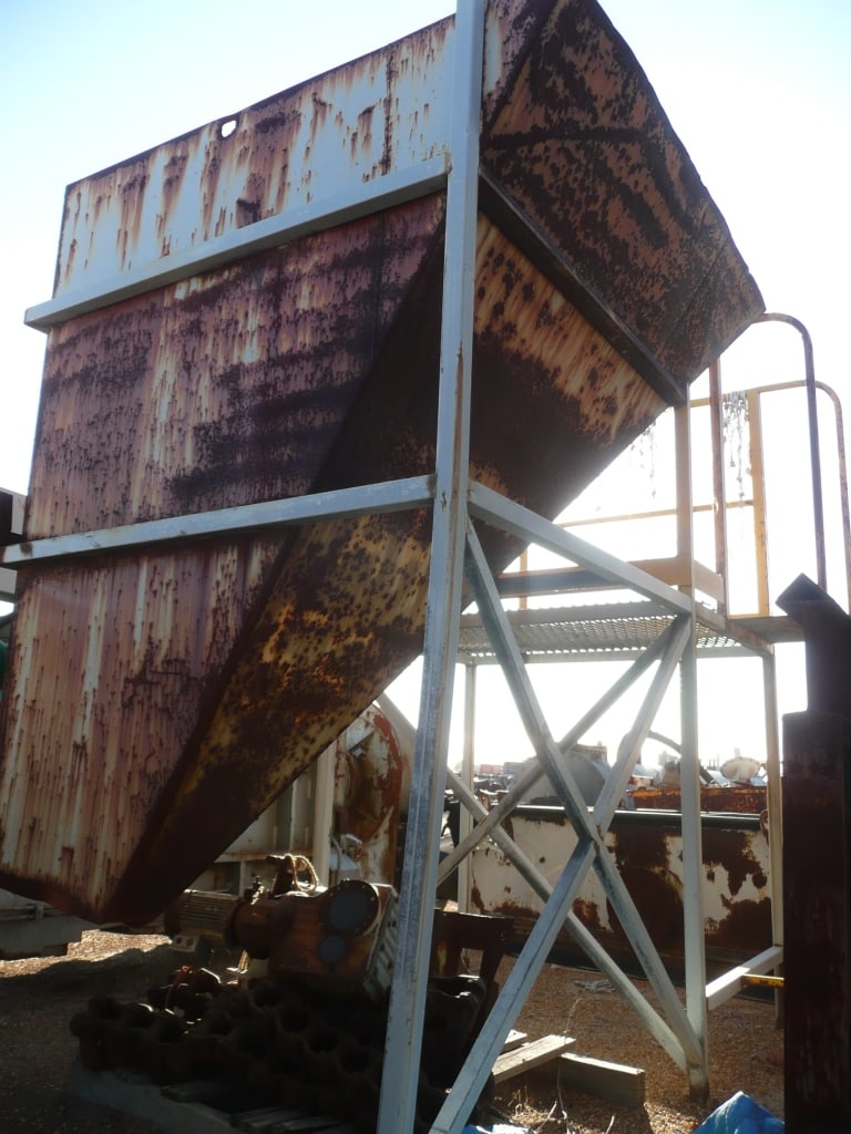 Hopper 2m x 1.5m x 2.5m on frame with adjoioning work platform with handrails.